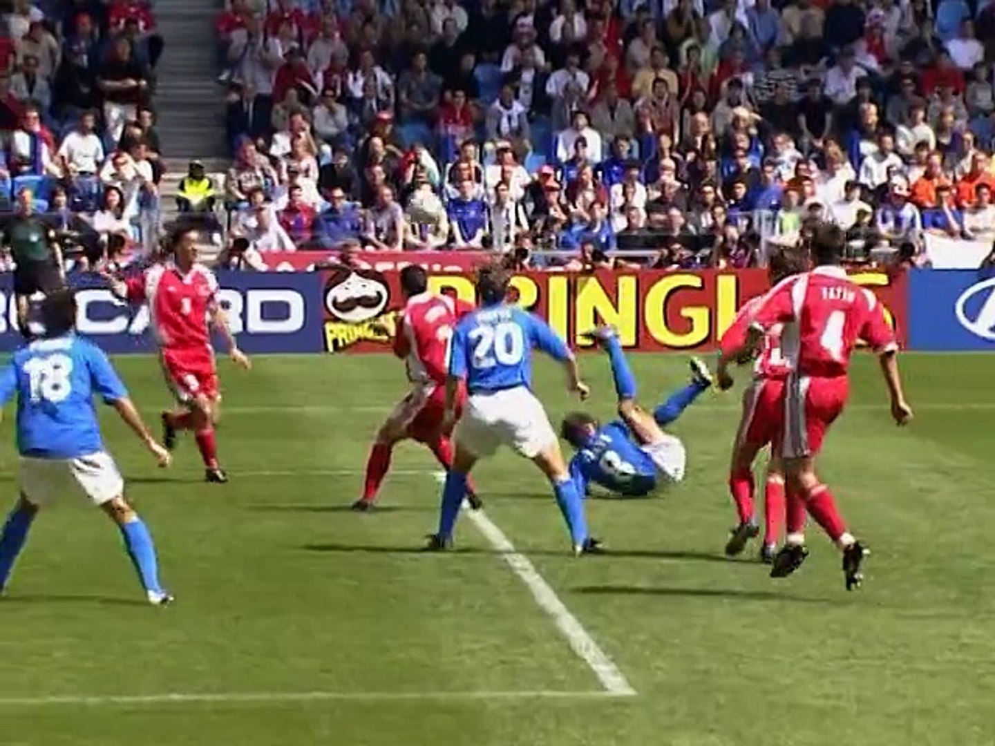 Les tricolores, rejoints au score à l'heure de jeu, ont cédé en prolongation sur un but d'andrea pirlo, brisant leur rêve de phase finale de l'euro 2000. Les italiens menent o score grace a un but de delvecchio il reste alor quelques seconde dans les arrets de jeu de cette 2eme periode kan tou a coup wiltord surgit et egalisa. Une rencontre disputée à rotterdam le 2 juillet 2000. France italie euro le 2 juillet 2000. Les typhoon grimés ressemblent à des clowns tristes et pour les réactions.
